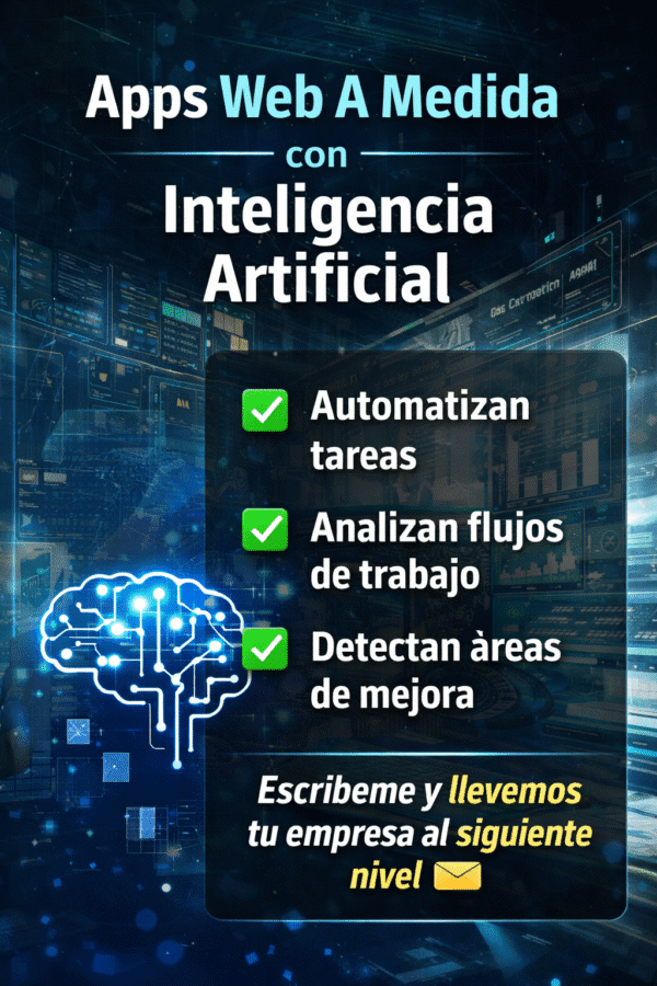 Desarrollo aplicaciones web personalizadas con IA, diseñadas para optimizar procesos, automatizar tareas y ayudar a las empresas a tomar mejores decisiones con datos reales.